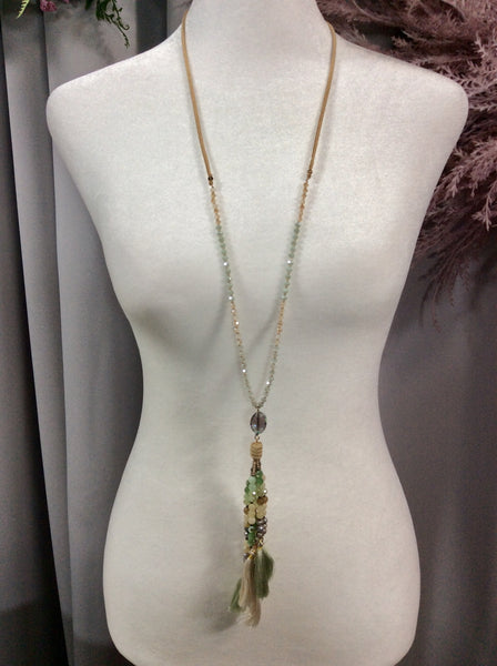Meet our Windsong Meadow Tassel Necklace, a truly stunning mixed-media piece that brings together soft color, natural textures, and the dreamiest boho detailing. This 42" necklace (with a 3" extender) begins with a warm light-tan leather chain that transitions into 6.5" of small faceted glass beads, beautifully alternating with brushed gold beads for that perfect hint of shimmer.