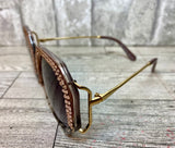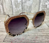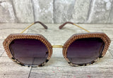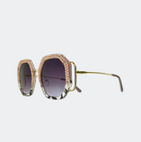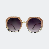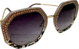 The trendiest sunglass shape of the year! These 1980's inspired hexagon lenses are accented with meticulously hand-set rose Austrian crystals rimming the upper half of each lense. These sunnies provide unparalleled aesthetics to transcend elegance. The injection frames are encrusted with rose crystals paired with a grey and black tortoise shell frame on the lower half of each lense. The polished gold bows have distinct 1980's detailing. The polycarbonate lenses with anti-scratch coating have a graduated grey tint and offer the most impact-resistant material available for sunglasses offering maximum eye protection plus 100% UV/UVB protection.