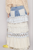 Our Bluebell Boho Maxi Skirt is a patchwork daydream of denim, florals, lace and light. This one-of-a-kind piece begins with a light wash denim yoke featuring classic denim pocket styling, a front zipper and button closure, and belt loops. The back of the waistband has a 10" elastic panel for comfort and fit. The real magic begins just below the top of the thigh, where six beautifully tiered panels of cotton take over in soft, breezy layers.
