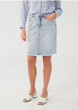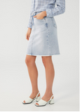 Transition from a day to night look effortlessly with our light wash denim pencil skirt. Traditional five-pocket styling, front zip and button waist with a fashion forward unfinished hem. Pair this wardrobe staple with your favorite tee or button down and sandals for summer and when the temps chill try a chunky sweater and boots.