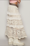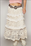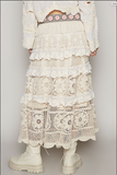 Embrace effortless elegance with our Meadow Bloom Skirt, a delicate fusion of vintage charm and modern grace. This midi-length skirt features a natural cotton crochet overlay, adorned with intricate floral patterns across three tiers, each separated by an airy net-like crochet tier that add depth and movement.