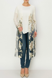 if you're looking for that perfect light layer to add a touch of elegance to your everyday outfit, our Magnolia Mesh Duster is an absolute must-have. This sheer, long-sleeved beauty from Origami is the epitome of effortless femininity. The base is a soft eggshell or cream mesh, which allows the piece to float over your look with grace and ease. What makes it truly stunning is the dreamy floral print - magnolias and gardenias in soft neutrals bloom across a deep denim-blue background, concentrated along the back, the lower half of the front, and the sleeves.