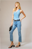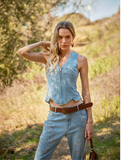 Say "Hello" to your new statement denim! Our Rugged Corset Vest is where laid-back Western charm meets modern edge. This fitted denim vest hugs you in all the right places with its corset-inspired seaming and flattering pointed hem that draws the eye to your waistline.