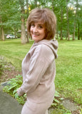 The coordinating hoodie top is designed with thoughtful details: dropped shoulders, a relaxed hood with drawstring, elegant 6" cuffs adorned with three gold-and-pearl buttons, and a flattering banded hem that brings the whole look together.