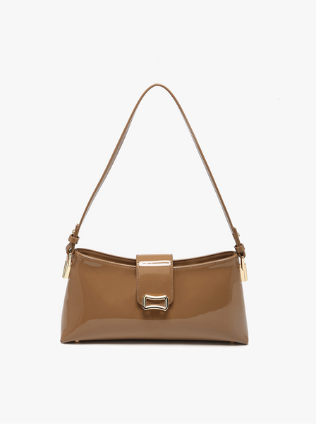 This high-gloss taupe vegan leather beauty is designed for the woman who appreciates timeless style with elevated detail. The sleek silhouette is complemented by rich gold hardware, giving it a warm, luxurious finish that pairs beautifully with everything from denim to dresswear.