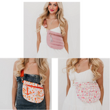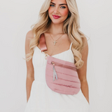 A trendy take on the updated fanny pack that can be worn in multiple ways. Wear it as a belt bag/fanny pack, crossbody, or shoulder bag. Available in three styles this bag has a fun half moon shape with a coordinating shiny canvas strap and gold hardware with a ribbon accent on the zipper close. We are obsessed with this light-weight style and its easy access front zipper.