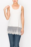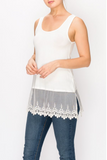 This buttery soft, egg shell white tank top has a front and back scoop neck and features a generous 8" embroidered tulle extender. This piece is perfect for layering under tops, sweaters cardigans and kimonos.