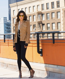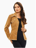 A versatile piece that combines rugged style with a touch of softness. This khaki camel denim peplum jacket is perfect for fall, made from a soft, stretch denim that offers both comfort and warmth. The jacket features unfinished hems on the bottom, cuffs, around the collar, top pocket edges, and yolk, giving it a laid-back, rustic look.