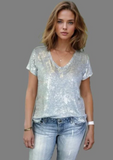 Our new favorite statement tee! The Sky's the Limit Shimmer Tee is all about easy elegance with a touch of sparkle. This relaxed-fit top features a gorgeous pale silvery blue base with a silver foil abstract print that catches the light just right - perfect for dressing up your denim or adding a little shine under a blazer.