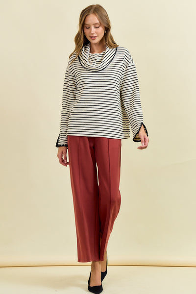Classic charm meets modern ease in our Avery Stripe Pullover. Designed in a soft, stretch knit of 95% polyester and 5% spandex, this top features an easy, oversized square-cut silhouette with drop shoulder that drapes gracefully for a relaxed yet refined look. The wide cowl neckline is lined and accented with contrast stitching for a touch of artisanal detail. Matching stitching trims the 4-inch sleeve slits, creating a subtle statement that elevates this everyday favorite.