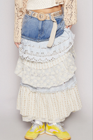 Our Bluebell Boho Maxi Skirt is a patchwork daydream of denim, florals, lace and light. This one-of-a-kind piece begins with a light wash denim yoke featuring classic denim pocket styling, a front zipper and button closure, and belt loops. The back of the waistband has a 10" elastic panel for comfort and fit. The real magic begins just below the top of the thigh, where six beautifully tiered panels of cotton take over in soft, breezy layers.