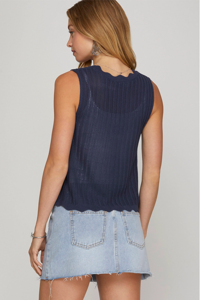 This navy blue sleeveless sweater vest features a beautifully scalloped neckline and hemline that adds just the right touch of softness. The adjustable front tie detail gives you styling versatility — wear it loosely tied for a relaxed feel or cinch it slightly for a more defined shape. It layers beautifully over a simple tank, fitted tee, or even a lightweight long sleeve as the seasons shift.