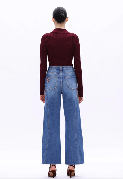 A true statement piece for your denim collection, our Harvest Bloom Wide Leg Jeans bring together timeless comfort with a touch of artistry. Designed with a flattering high rise and wide leg silhouette, these jeans elongate your shape while giving you effortless style.