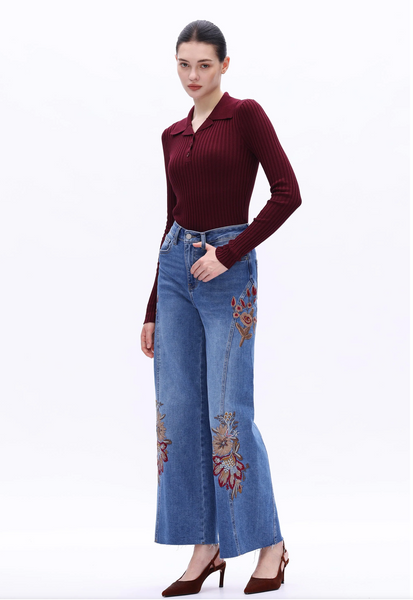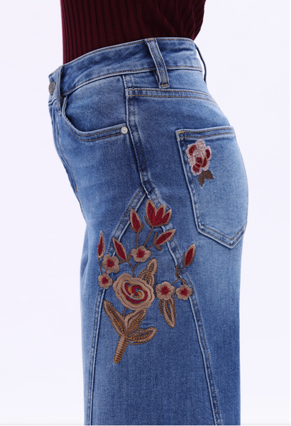 The soft stretch denim ensures a comfortable fit, while the unfinished hem adds just the right amount of modern edge. Intricate floral embroidery blooms along the legs in rich autumn tones, making these jeans the perfect pair to transition through the seasons.