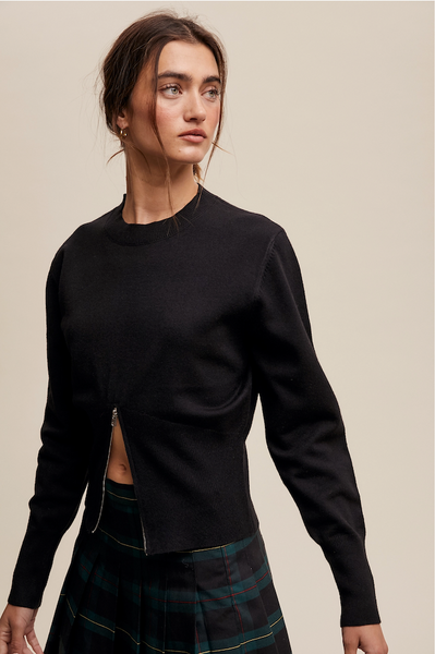 A classic design with a modern twist, our Monroe Zip Detail Pullover Sweater is the perfect mix of comfort and style. Crafted from a soft black knit blend, it features a smooth feel with just the right amount of stretch for all-day wear. The clean crew neckline and long sleeves make it easy to layer, while the center-front zipper adds a subtle touch of edge. Finished with ribbed cuffs and a fitted hem for a flattering shape, this versatile black sweater pairs effortlessly with jeans, skirts, or layered over your favorite dress. It’s an easy go-to piece that transitions seamlessly from casual days to polished evenings.