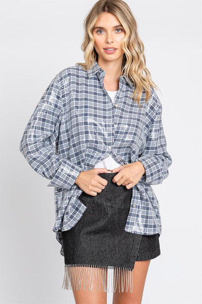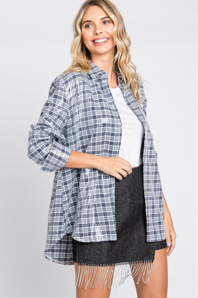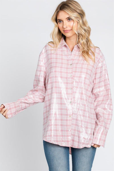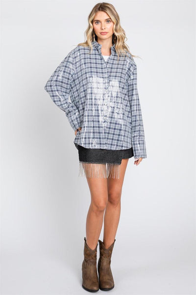 Our Pretty In Plaid Button Down takes the classic plaid shirt and gives it a sparkling twist. Made from a soft, comfortable blend of 95% polyester and 5% spandex, this shirt is completely covered in small, individually machine-stitched clear sequins that shimmer beautifully with every move.