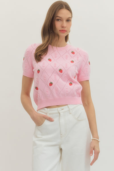 This darling short sleeve sweater is one of those pieces that instantly makes you smile. Crafted in a soft, breathable cotton knit with just a touch of stretch, it features a classic argyle pattern with subtle dimpled texture for added interest and dimension. Scattered throughout are the sweetest embroidered red strawberries with green stems — the perfect pop of playful personality.