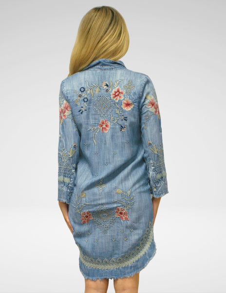 What truly sets the Wendy apart is its exquisite embroidery. Floral and geometric motifs are stitched across the front, down the sleeves, and beautifully placed along the back and hemline, creating a boho-inspired tapestry effect on denim.